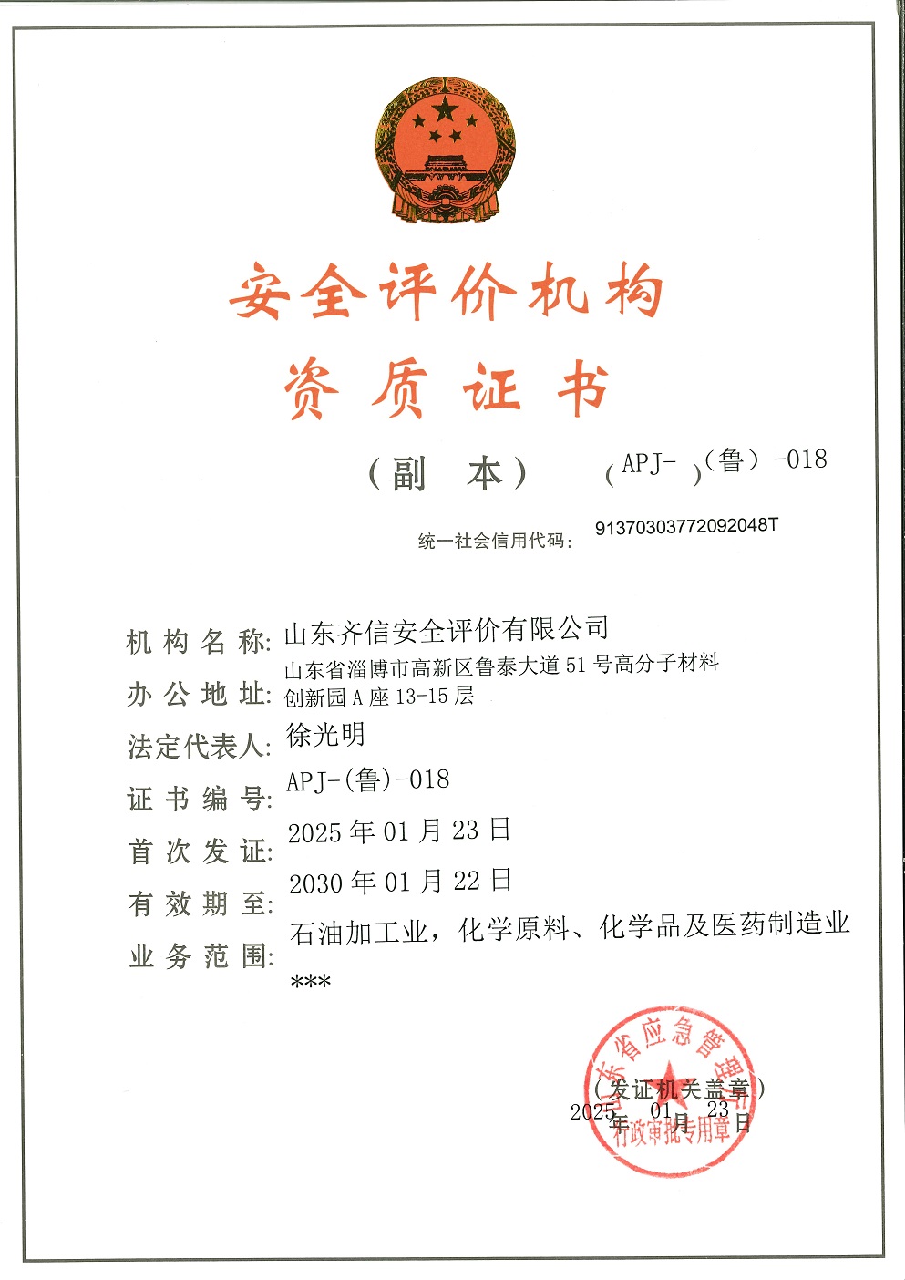 山東齊信安全評價有限公司成立于2005年3月,注冊資本300萬元人民幣,固定資產總值804.8728萬元。法定代表人徐光明,注冊地址及辦公地址位于淄博高新區魯泰大道51號高分子材料創新園A座13-15樓。2005年9月取得安全評價機構乙級資質。自國家應急部1號令實施以來,公司于2020年1月15日取得新安全評價資質,業務范圍包括:陸上油氣管道運輸業;石油加工業,化學原料、化學品及醫藥制造業;金屬冶煉。2018年12月21日取得安全生產標準化二級評審單位,評審范圍:危險化學品、紡織、建材、輕工、冶金、機械。 公司現有人員41人,其中專職安全評價師37人,注冊安全工程師26人,研究員1人、碩士5人、雙學士1人,山東省安全專家庫專家1人、教授級高工1人,高級工程師8人、工程師22人,專職危險化學品標準化評審員、工商貿標準化評審員30人,本科以上學